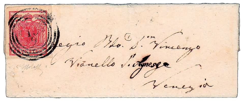 LOMBARDO VENETO - 1851, 15 c. I tipo carta a coste (14) esemplare con costolatura molto evidente su letterina da Mirano per Venezia, 10/9. (G. Bolaffi).(LETTERA)