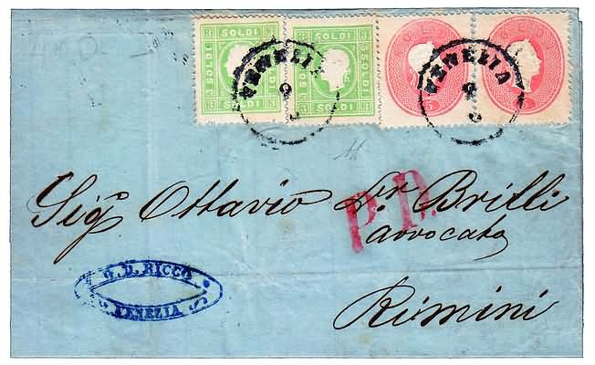 LOMBARDO VENETO - 1863, 3 s.verde (33) due esemplari + 5 soldi rosa (35) due esemplari su lettera da Venezia per Rimini il 9/6/63. Ottima qualità.(LETTERA)