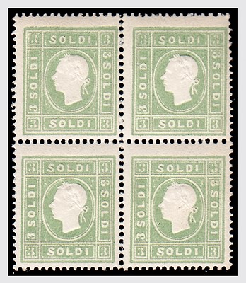 Lotto 367 | LOMBARDO VENETO - 1862, 3 soldi verde giallo (35) fresca quartina, gomma...
