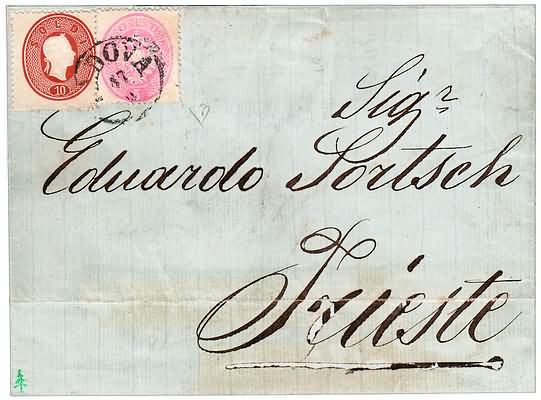 LOMBARDO VENETO - 1863, 10 s.bruno mattone scuro (34a) + 5 c.rosa dent.14, IV emissione più corto del normale con 17 denti (38c), su lettera da Padova per Trieste il 17/9/63. Rara combinazione. (Cert. E. Diena).(LETTERA)
