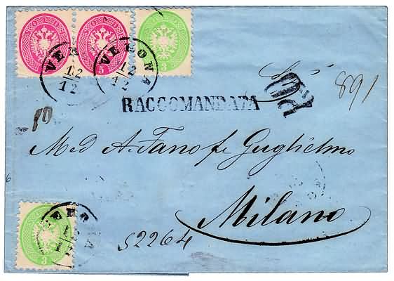 LOMBARDO VENETO - 1865, 3 soldi verde (42) 2 esemplari + 5 soldi rosa (43) 2 esemplari, lettera raccomandata da Verona per Milano, 12/12. Francobolli per la raccomandazione, al verso, rotti nell'apertura e quasi completamente asportati.(LETTERA)