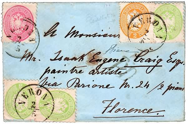 LOMBARDO VENETO - 1865, Affrancatura tricolore composta da : 2 s.giallo dent.14 (36) + tre esemplari da 3 s.verde dent.9 1/5 (42) + 5 s. rosa dent. 9 1/2 (43) su lettera da Verona per Firenze il 2/5/65. Francobolli in buono stato, rarità. (Cert. R. Diena)