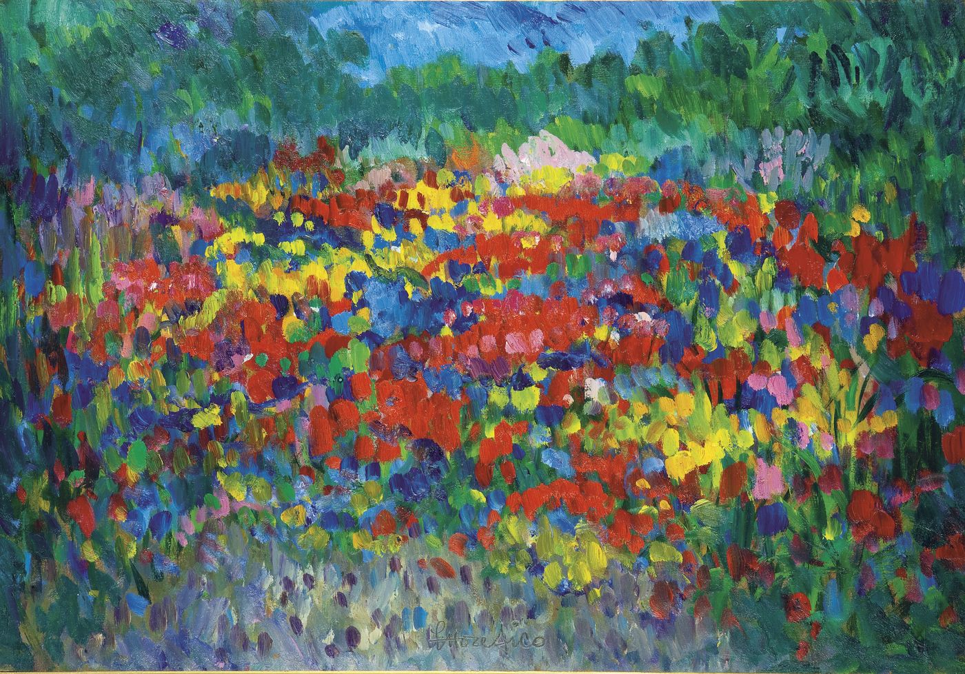 FICO ETTORE (Piatto Biellese (VC) 1917 - 2004 Torino) - "Magico giardino" anni '80, 35x50 olio su tavola. Opera firmata in basso al centro