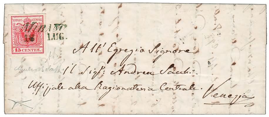 LOMBARDO VENETO ANNULLAMENTI - 1850, MIRANO azzurrastro (p.12) su 15 c.rosso, I tipo, I tiratura (3a) su lettera diretta a Venezia il 18/7/50. (A. Diena - Giulio Bolaffi - Cert.Bottacchi).(LETTERA)