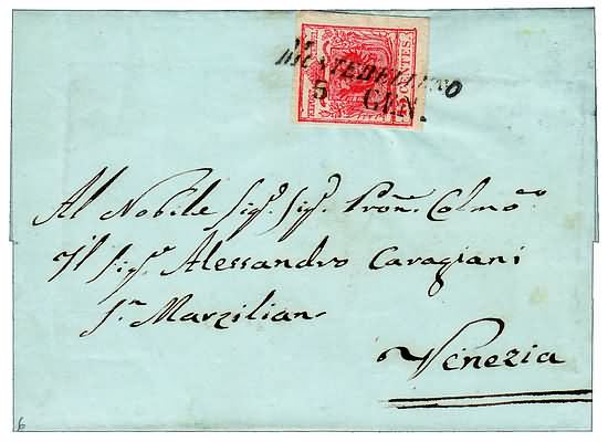 LOMBARDO VENETO ANNULLAMENTI - MONTEBELLUNO SI IG (p.6) su 15 c. (6) lettera per Venezia, 5/1.(LETTERA)