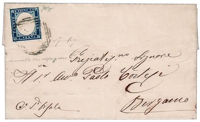 LOMBARDO VENETO ANNULLAMENTI - 1859, RHO, LOV (p.R1) su Sardegna 20 c. (15Ba) corto in alto, su lettera per Bergamo, settembre '59, annullo come sempre praticamente non leggibile. (Cert. Caff.).(LETTERA)