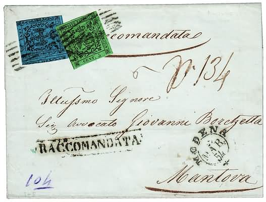MODENA - 1854, 5 c. verde (1) + 40 c. azzurro (6) su raccomandata da Modena...