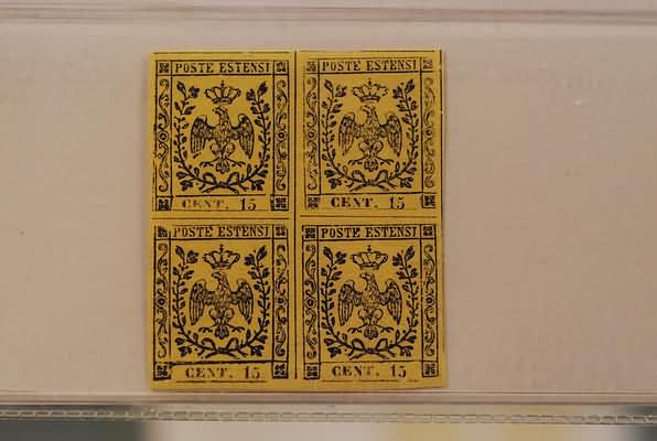 MODENA - 1852, 15 c.giallo (3) blocco di quattro, 2 esemplari gomma...