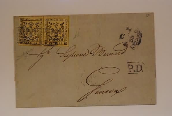 MODENA - 1859, 15 c. giallo (3) coppia orizzontale su lettera da Reggio per Genova, 12/4/59. Da esaminare per una grinza orizzontale.(LETTERA)