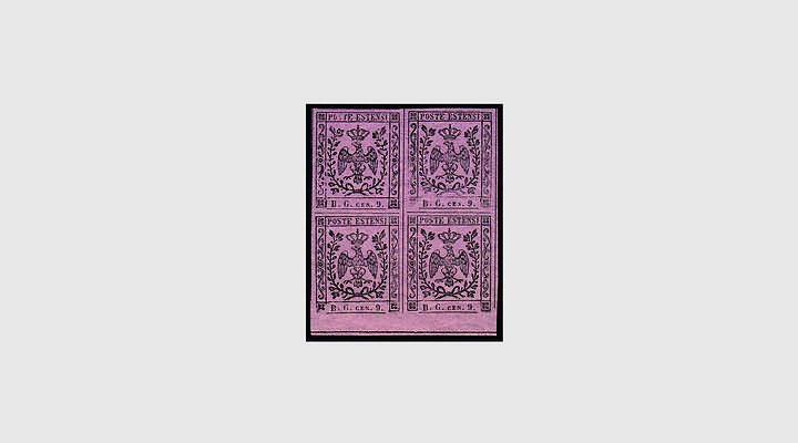 MODENA - 1853, Segnatasse per giornali 9 c. lettere "B.G." piccole, violetto lillaceo (2a) quartina, gomma integra. Di pregio.(GOMMA INTEGRA)