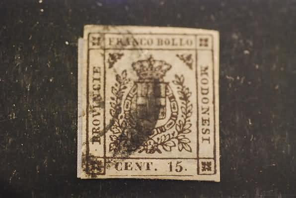 MODENA - 1859, Governo provvisorio, 15 c. bruno scuro (13a) annullato a Carrara, ancora aderente al minimo frammento originario. (E. Diena, Cert. Raybaudi).(USATO)