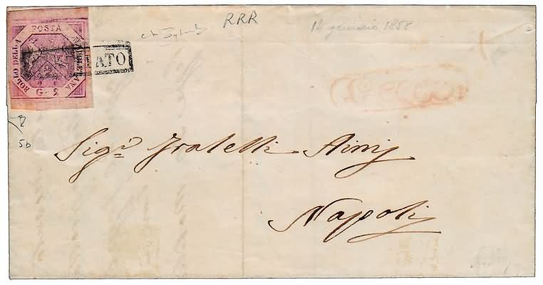 NAPOLI - 1858, 2 gr. lilla rosa, I tavola (5b) su lettera da Lecce per Napoli il 14/1/58. Tonalità molto rara. (E.Diena - Cert. Raybaudi).(LETTERA)
