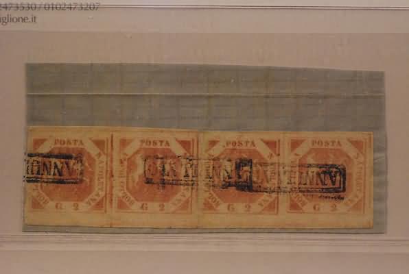 NAPOLI - 1860, 2 gr. rosa brunastro III tav. (7) in striscia di quattro esemplari con grandi margini.(FRAMMENTO)
