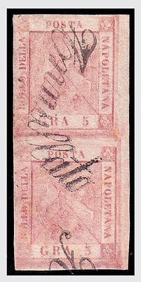 NAPOLI - 1858, 5 gr. rosa carminio II tavola (9) coppia verticale, annullo a...