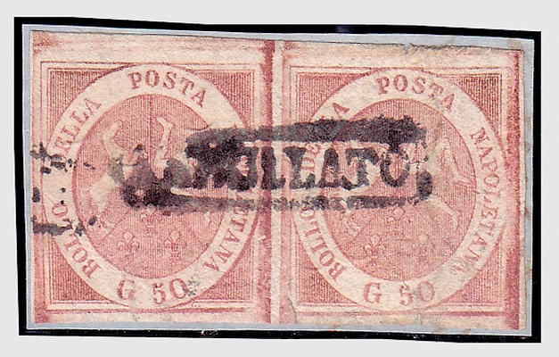 NAPOLI - 1858, 50 gr. brunastro (14) coppia orizzontale. Qualche difetto, da esaminare. (Cert. Fiecchi. Cert. Sottoriva).(FRAMMENTO)