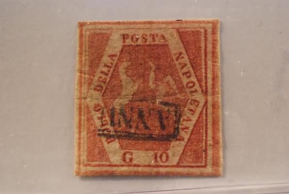 NAPOLI - 1859-61, Falsi d'epoca, 10 grana rosa carminiotipo III (F5a) carta vergata verticalmente. Grinza orizzontale. Rarissimo.(USATO)