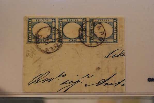PROVINCE NAPOLETANE - 1861, 2 gr. azzurro (20b) striscia verticale di 3 su ampio frammento.(FRAMMENTO)