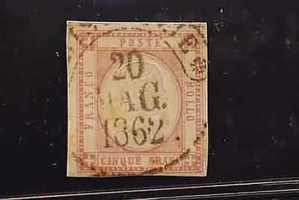 PROVINCE NAPOLETANE - 1861, 5 gr. rosa lilla (21b) ancora aderente al supporto. (Raybaudi).(USATO)