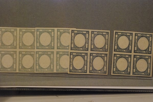PROVINCE NAPOLETANE - 1861, 50 grana grigio perla (24) quattro quartine in tonalità differenti. Tutti gli esemplari firmati G. Bolaffi.(GOMMA INTEGRA)