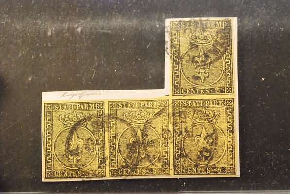 PARMA - 1852, 5 c. giallo arancio (1) striscia di quattro a seggiola usata su piccolo frammento. Rara. (Fiecchi A.Diena - Bargagli - Cert.Sorani).(USATO)