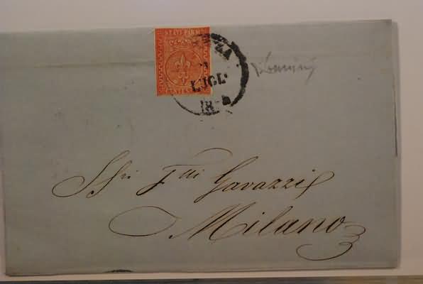 PARMA - 1855, 15 c.vermiglio (7) ben marginato, piega orizzontale d'archivio stirata, su lettera da Piacenza per Milano, 21/7/55. (Donnini).(LETTERA)