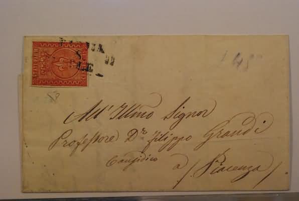 PARMA - 1855, 15 c.vermiglio (7) su lettera da Parma per Pontremoli a Piacenza nell'aprile '55. Esemplare freschissimo.(LETTERA)