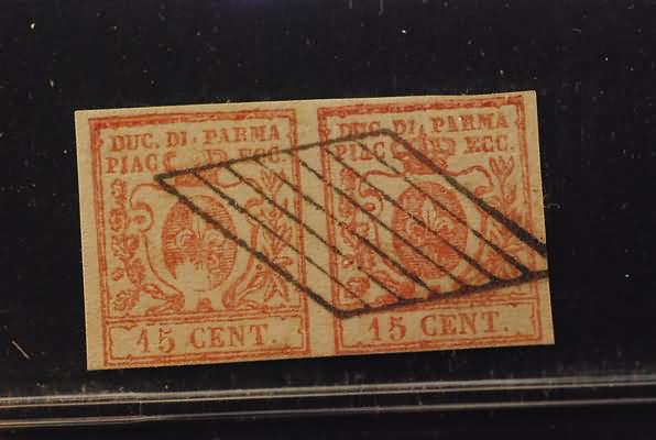 PARMA - 1859, 15 c.vermiglio (9) coppia orizzontale. (A. Diena).(USATO)