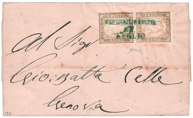 PARMA ANNULLAMENTI - 1861, MONTICELLI D'ONGINA, lineare su 3 righe, azzurro (p. R1) su Sardegna 10 c. (14Cc) coppia verticale su lettera per Genova, 18/7. Francobolli ben marginati, da esaminare per qualche ossidazione, comunque rara. (Cert. Ghiglione).(L