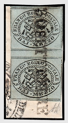 STATO PONTIFICIO - 1852, 1/2 baj grigio azzurro (1a) coppia verticale con l'interspazio di gruppo. (Cert. Raybaudi).(FRAMMENTO)
