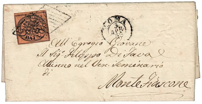 STATO PONTIFICIO - 1856, 3 baj bistro arancio (4) 8 filetti, su lettera da Roma per Montefiascone, 3/4/56.(LETTERA)