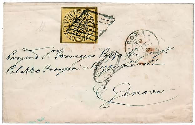STATO PONTIFICIO - 1866, 4 baj giallo (5A) con 8 filetti su bustina da Roma per Genova, 30/10/66.(LETTERA)