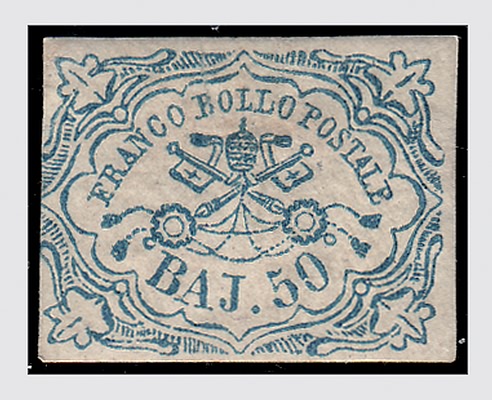 STATO PONTIFICIO - 1852, 50 baj azzurro (10) esemplare rigommato, leggermente corto a sinistra, taglietto riparato. Di buon aspetto.(SENZA GOMMA)