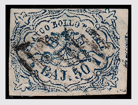 STATO PONTIFICIO - 1864, 50 baj azzurro oltremare scuro (12). Bella qualità. (Cert. Sorani).(USATO)