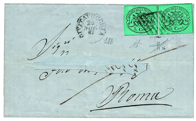 STATO PONTIFICIO - 1867, 5 c. azzurro verdastro 16) 2 esemplari su lettera da...