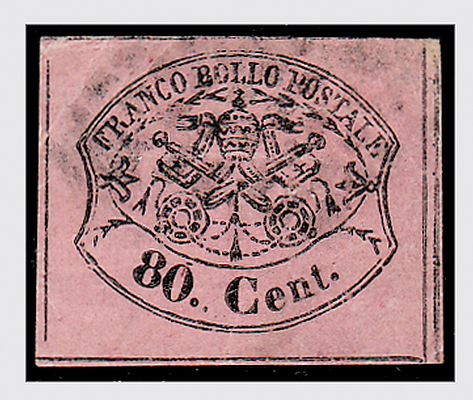 STATO PONTIFICIO - 1867, 80 c. rosa lillaceo (20). Da esaminare. (Cert. R. Diena).(USATO)