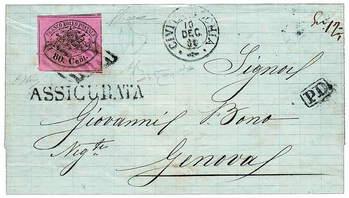 STATO PONTIFICIO - 1869, 80 c.rosa lillaceo vivo (20a) isolato su lettera assicurata da Civitavecchia a Genova il 10/12/69. Bollo ASSICURATA (punti 10). Bella qualità, molto raro l'uso isolato. (Em:Diena - A.Diena - G.Oliva - Raybaudi - Cert.R.Diena).(LE