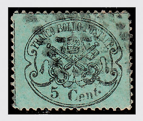 STATO PONTIFICIO - 1868, 5 c. azzurro verdastro (25a). (Cert. Raybaudi).(USATO)