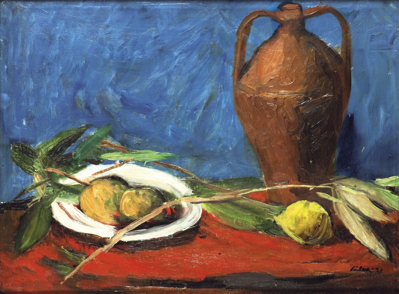 PAULUCCI ENRICO (Genova 1901 - 1999 Torino) - "Natura morta con anfora"1931, 45x60 olio su tela. Opera firmata e datata in basso a destra. Esp.: -Torino, 1996, Palazzo Bricherasio," Omaggio a Paulucci" . 6 - 29 settembre 1996 (etichetta al retro). Pubblicato sul catalogo della mostra a pag. pag. 60; - Ginevra, 1997, Palazzo delle Nazioni Unite; - La Spezia, 2009, Camec, 10° Anniversario della morte. Pubblicato a colori sul catalogo della mostra a pag. 105.