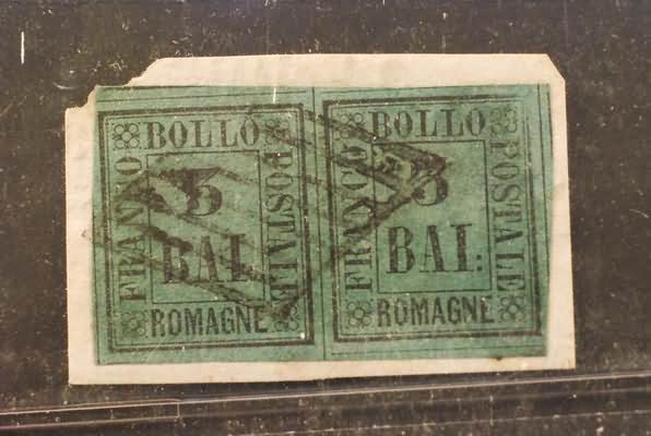 Lotto 913 | ROMAGNE - 1859, 3 baj verde scuro (4) coppia ben marginata su frammento....