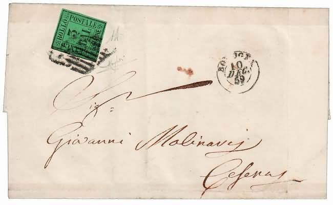 ROMAGNE - 1859, 3 baj verde scuro (4) su lettera da Bologna per Cesena, 10/12/59. (A. Diena. Cert. Raybaudi Luigi).(LETTERA)