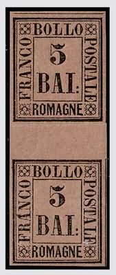 ROMAGNE - 1859, 5 baj violetto (6) coppia verticale con interspazio. (G....