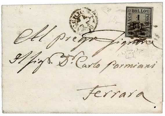 ROMAGNE ANNULLAMENTI - 1859, COMACCHIO muto (p.6) su 1 baj (2) su lettera per Ferrara, dicembre '59. (Em. Diena, Raybaudi, Cert. E. Diena).(LETTERA)