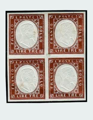 REGNO DI SARDEGNA - 1861-63, IV emissione, i 6 valori nelle tinte del periodo /13E/18A) in blocchi di quattro. Splendida qualità. (Cert.Chiavarello per il 20 cent.).(GOMMA INTEGRA)