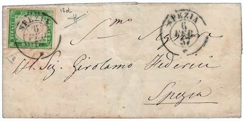 Lotto 995 | REGNO DI SARDEGNA - 1857, 5 c. verde smeraldo (13d) isolato su lettera da...