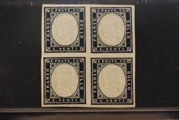 REGNO DI SARDEGNA - 1862, 20 c.indaco (15E) in blocco di quattro, di ottima qualità.(GOMMA ORIGINALE)