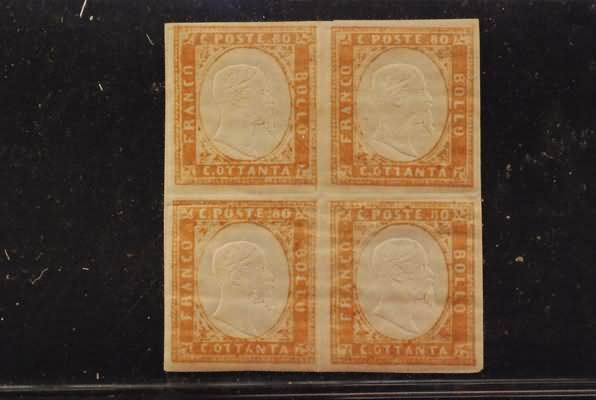 REGNO DI SARDEGNA - 1858, 80 c. bistro arancio (17) in blocco di quattro,...