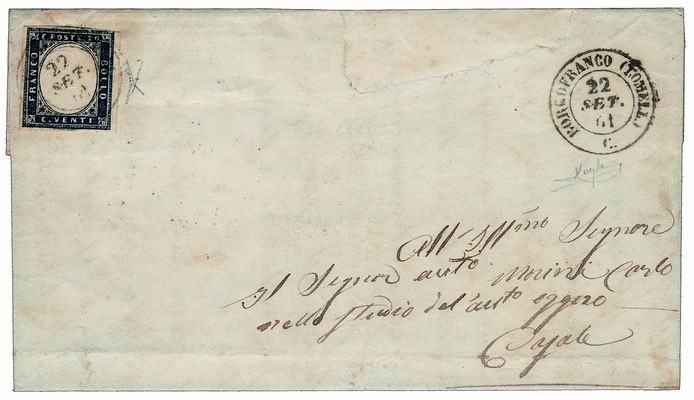 REGNO DI SARDEGNA ANNULLAMENTI - 1861, BORGOFRANCO (LOMELL.A) (p.R2) su 20 c.(15B) lettera per Casale il 22/9/61. Margine superiore a filo. Annulamento rarissimo. (Cert. Bottacchi "buono stato")(LETTERA)