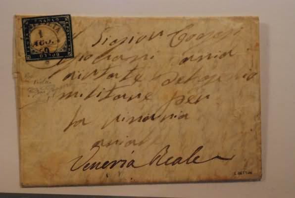 REGNO DI SARDEGNA ANNULLAMENTI - 1859, CAMPIGLIA doppio cerchio blu/violaceo (p.-) su 20 c. (15B) con margini da esaminare, su lettera per Venaria Reale, 1/8/59. Insieme non fresco, annullo non catalogato in tale colore. (Gaggero).(LETTERA)
