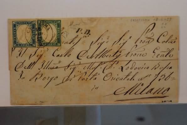 REGNO DI SARDEGNA ANNULLAMENTI - 1857, CASATISMA (p.4) su lettera affrancata con 5 c.verde smeraldo (13f) + 20 c.cobalto chiaro (15a) diretta a Milano il 18/6/57. Margini grandi in entrambi i valori, qualità da esaminare.(LETTERA)