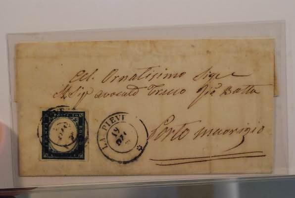 REGNO DI SARDEGNA ANNULLAMENTI - 1858, LA PIEVE (p.7) su 20 c.azzurro oltremare scuro (15Aa) lettera per Porto Maurizio il 19/12/58. Margini molto grandi.(LETTERA)